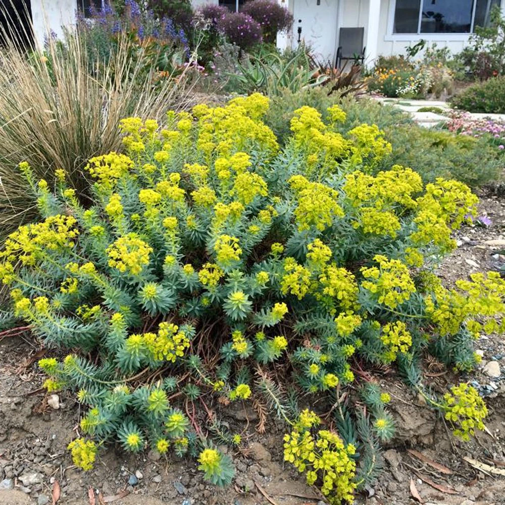 Blue Haze Leafy Spurge is distinguished by a clumping, bushy habit, unusual powder-blue foliage and contrasting chartreuse bracts. This combination of distinctive traits sets Blue Haze apart from all other existing varieties of perennial euphorbia and will be the source of many positive comments from the neighbors. Truly blue foliage? Yeah!