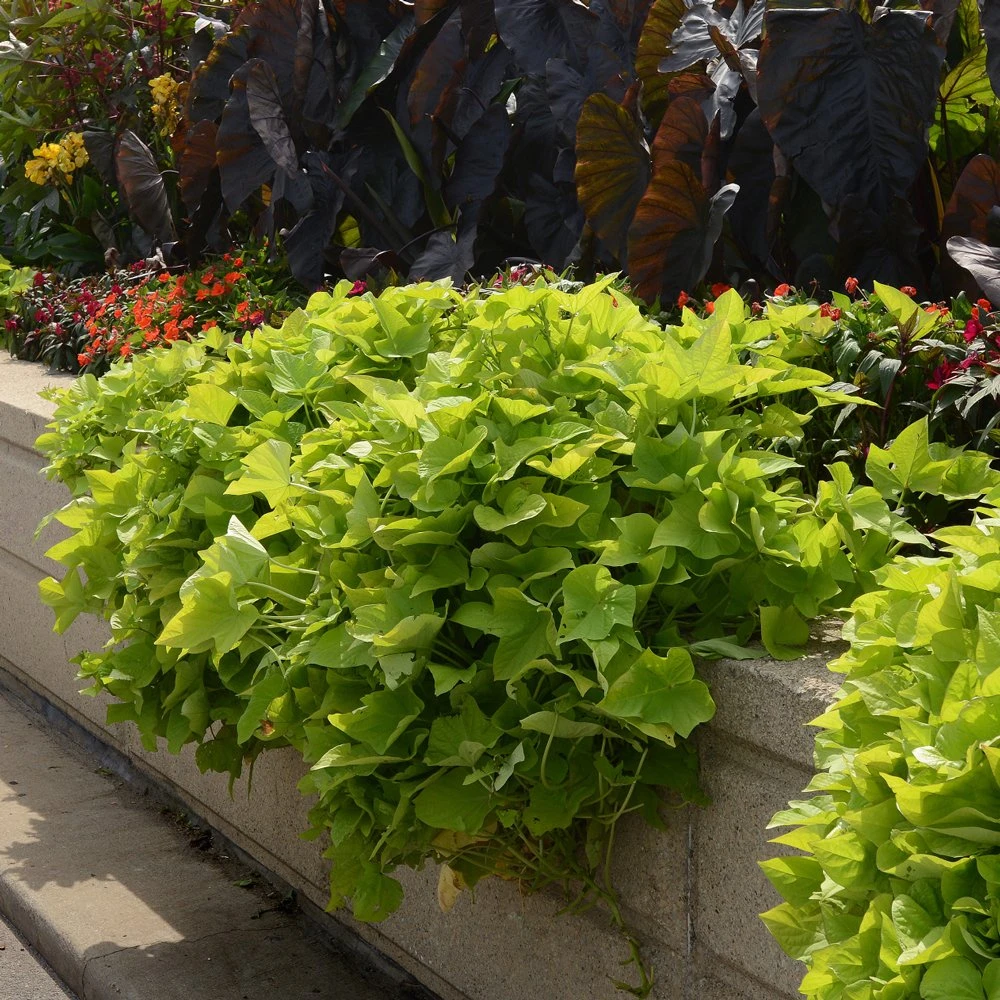 Marguerite Ipomoea Plants produce brilliant lime-green to bright yellow-green foliage, a great contrasting color! Ipomoea’s are heavy feeders, so they benefit greatly from regular fertilizer feedings. They also prefer soil that does not dry out completely. When grown in containers, once the top is dry to about 1 inch, water it and check regularly during really hot weather.